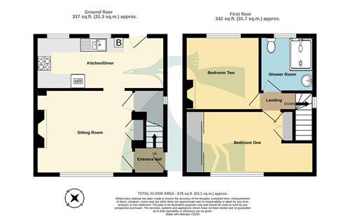 No: 6 is a chain free end of terrace house with attractive brick elevations under a pitched, interlocking tiled roof. The accommodation within is spacious and well proportioned, and has ample storage fitted throughout. A bright sitting room lies to the front with traditional focal point fireplace, and a useful storage cupboard/pantry. To rear the kitchen/diner runs the full width of the property and is fitted with a range of matching cabinetry and integrated cooking appliances. To the first floor are two double bedrooms, the principal of which enjoys extensive built in wardrobes whilst the other has a fireplace. Both bedrooms are serviced by a spacious shower/wet room. The property is double glazed plus gas centrally heated, and offers great scope for modernisation and improvement.