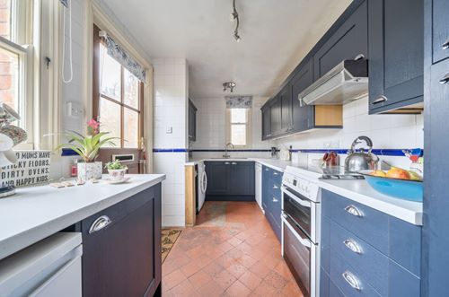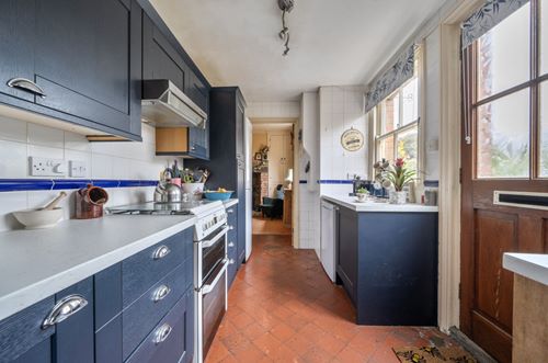 This charming semi-detached home offers a wonderful blend of character, space and outlook, with high ceilings and period features enhancing the overall feel throughout. A welcoming entrance hall, complete with a deep understairs cupboard and cloakroom/WC, leads through to the principal living areas, with a beautiful winding staircase rising to the first floor. The sitting room is particularly attractive, enjoying delightful views over the village field and across Lyminge, complemented by a feature fireplace. A separate family room also benefits from similar views, providing flexible living space. To the rear, the kitchen is stylishly appointed with navy blue units and marble-effect worktops, offering space for white goods and a clean, contemporary finish. Leading from here is a delightful dining room, full of charm, with a brick-built open fireplace and traditional built-in cupboards that add warmth and character.