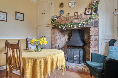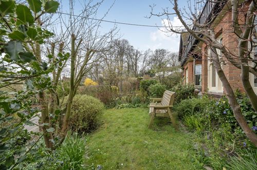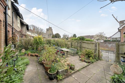 To the rear, the property enjoys a paved courtyard garden, enclosed and well stocked with established border beds, creating a private and peaceful setting with views towards the attractive field church.