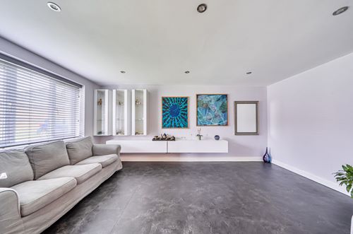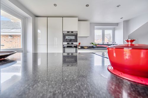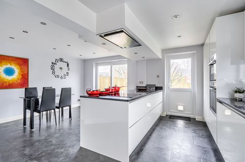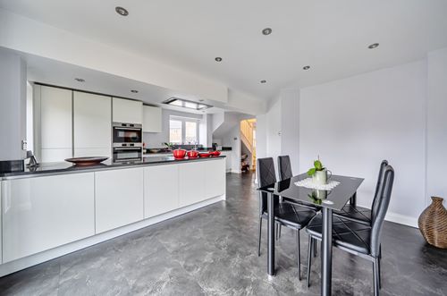 The ground floor accommodation comprises a welcoming entrance hall with stairs rising to the first floor, along with a contemporary updated downstairs cloakroom/WC. A separate sitting room offers an attractive and comfortable living space, featuring floating white high-gloss shelving and matching glass display cabinets. The heart of the home is the impressive kitchen/dining room, fitted with a range of sleek white high-gloss units complemented by quartz worktops. An island incorporates an inset induction hob with a modern ceiling-mounted extractor hood. Integrated appliances include a dishwasher, double ovens (combination and microwave), fridge freezer and washing machine. Sliding double doors open directly onto the rear garden, with an additional door providing further external access.