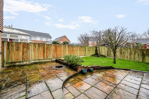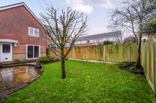 The rear garden is attractively arranged, featuring a neatly shaped lawn interspersed with specimen trees, along with a paved patio that extends across the width of the property ideal for outdoor dining and entertaining. The patio also provides access to the side gate opening onto the driveway and detached double garage which benefits from two up-and-over doors, one of which is electrically operated, and is equipped with power and lighting. Ample driveway parking to the front for several vehicles.