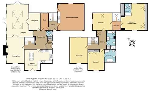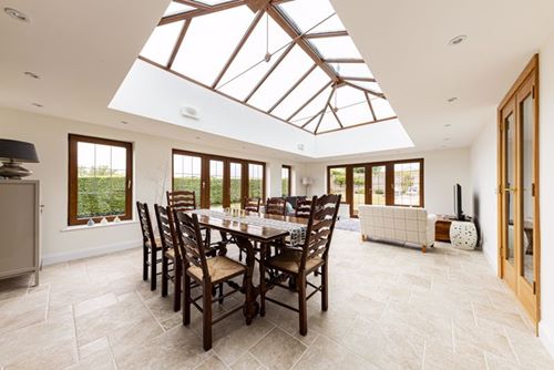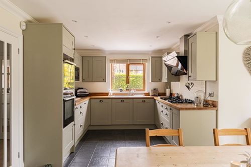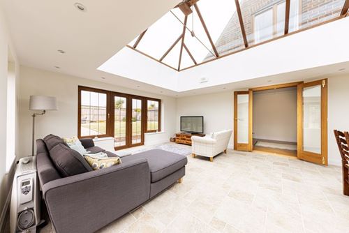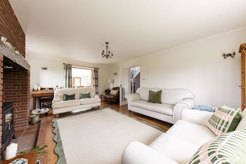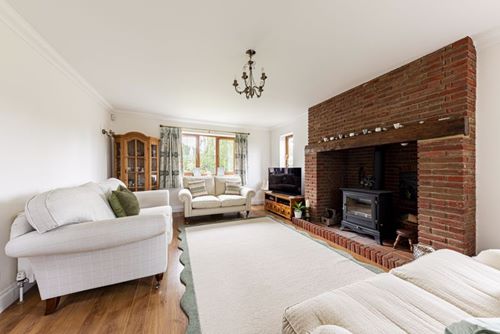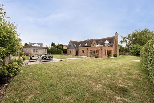 Spacious and extended stylish modern detached house in large level plot backing onto open fields. Very well presented by the present owners, set well back from the road, the accommodation includes drawing room, sitting room, orangery, kitchen breakfast room, study, 4 large first floor bedrooms and two with en-suite bathrooms, main bathroom, double garage with utility area, downstairs cloakroom/WC. The spectacular orangery has windows and doors to all sides and a large roof lantern window over whilst the drawing room has a traditional brick fireplace and woodburning stove. With gas CH and double glazing, the whole house has a bright and airy feel and is set in the middle of large surrounding gardens. There is a second front door next to the garage by the second staircase so the large bedroom over the garage could easily be used as independent “annexe” accommodation for a family member.