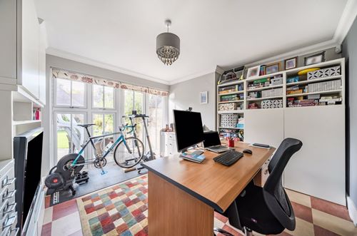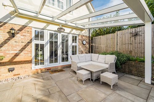 The rear garden is beautifully landscaped and thoughtfully designed to offer both privacy and tranquility. An extensive shaped terrace with a covered glass veranda creates a serene space for year-round entertaining, complemented by raised beds that provide colour and seasonal interest. To the front, the property enjoys a well-stocked garden with a variety of mature plants and shrubs, enhancing the home’s overall charm and curb appeal.