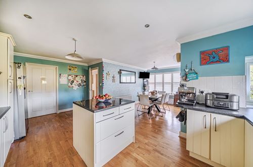 The ground floor features a welcoming entrance hall leading to a superb, square-shaped sitting room, elegantly presented with a contemporary fireplace as its focal point. Fully glazed double doors with side panels open onto a covered glass sun terrace, thoughtfully fitted with an electronic, remote-controlled blind, the perfect space for year-round enjoyment. To the front of the property lies a substantial kitchen/dining room, fitted with matching wall and base units, a central island, and worktops incorporating a full-size integrated dishwasher, microwave, oven, and gas hob. Adjacent is a useful utility room with space for white goods. The ground floor also offers a cloakroom/WC, a family room with access to the attractive gardens, and a double bedroom, ideal for guests or multigenerational living. Upstairs, the first-floor landing leads to the impressive master bedroom, ideally positioned at the rear of the property and featuring a striking cathedral ceiling and a luxurious en-suite shower room. The second bedroom also benefits from a cathedral ceiling, built-in wardrobes, and an en-suite shower room. There are two further bedrooms on this level, along with a well-appointed family bathroom.