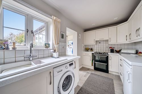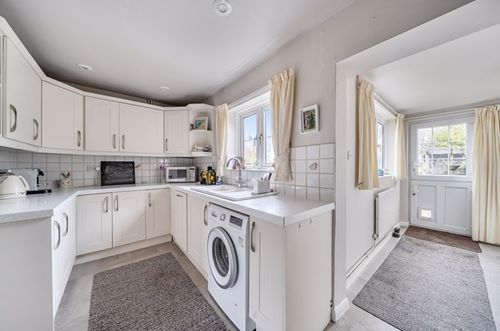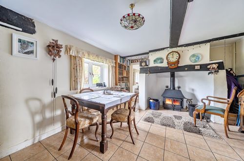 The main cottage welcomes you through an entrance porch into a charming reception hall featuring stairs to the first floor and a large inglenook fireplace housing a generous wood-burning stove. From here, a spacious kitchen offers integrated appliances including a slimline dishwasher and electric cooker, with space for a fridge and washing machine. A utility room provides further storage with matching units, space for a tall freezer, and a stable door opening directly to the gardens.