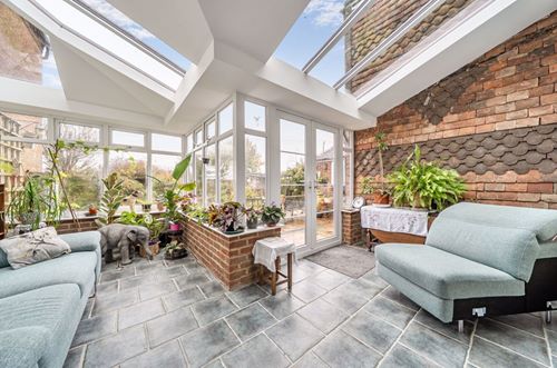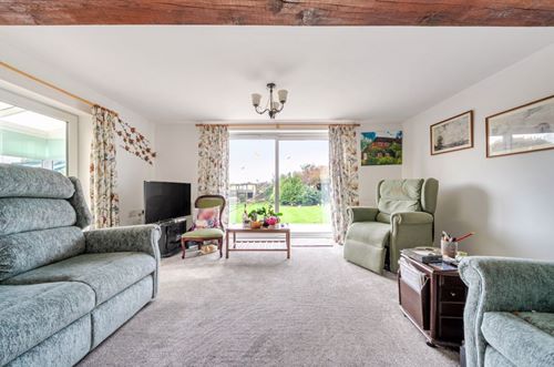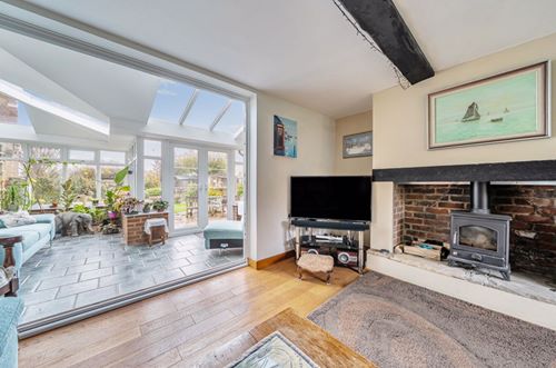 The sitting room is both cosy and characterful, with a wood-burning stove and bi-folding doors that open into a bespoke conservatory, a wonderful space to relax while enjoying views across the gardens and grounds.