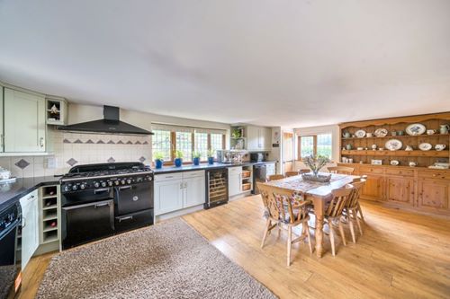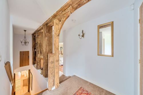 Upstairs, a beamed galleried landing leads to five double bedrooms, two with en-suites, plus a family bathroom.