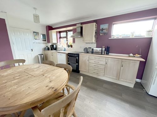 Set on the edge of Sandwich town centre, this modern detached family home offers, extended accommodation within a quiet cul-de-sac setting. The ground floor features a welcoming sitting room with a wood-burning stove, alongside a spacious kitchen/dining room. The kitchen is well-equipped with a range of coordinated units, enhanced by a bespoke pantry cupboard and a practical utility/laundry room with access to the integral garage. Double doors link the kitchen and sitting room, while sliding patio doors lead to a bright conservatory that overlooks and opens onto the garden. A convenient cloakroom/WC completes the ground floor.