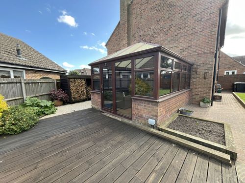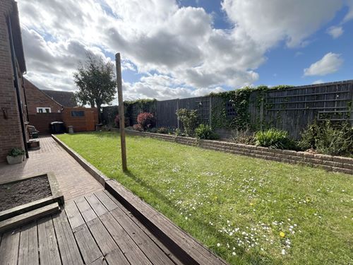 To the front is a small lawned garden bordered by flower beds, while the adjacent block-paved driveway provides off-road parking, EV charger and access to the garage. Pedestrian side access leads to the rear, where a raised lawn spans the full width of the plot, and a decked seating area adjoins the conservatory. The garden is well stocked with a variety of mature planting and also features a timber garden shed.